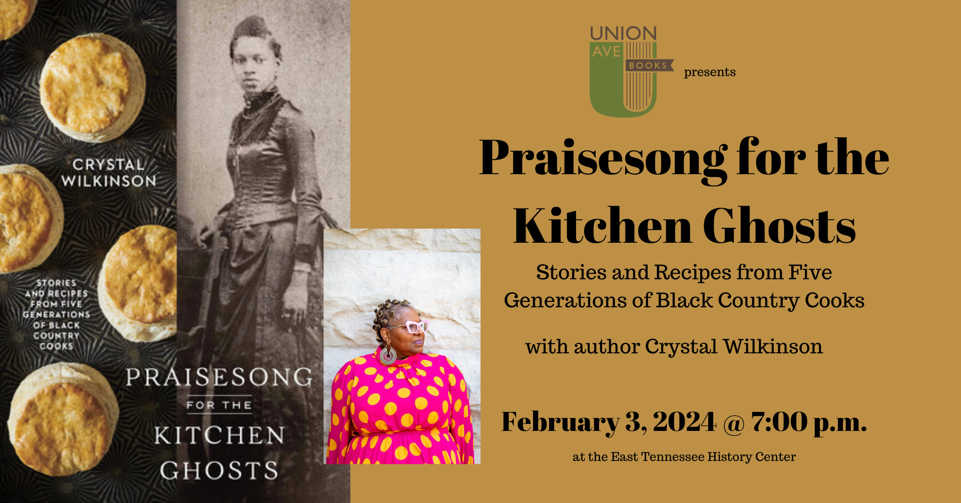03 February 2024Award-winning author, poet, and professor Crystal Wilkinson will speak on her book, Praisesong for the Kitchen Ghosts. In this book, Wilkinson gifts us a key that unlocks not only her own treasured memories but methods for embracing our own personal histories. Join the East Tennessee Historical Society and co-sponsors Union Ave Books as Ms. Wilkinson shares stories behind recipes rooted deep in the past. Praisesong for the Kitchen Ghosts brings to life a culinary and artistic inheritance that honors the mothers who came before, the land that provided for generations of her family, and the untold heritage of Black Appalachia.