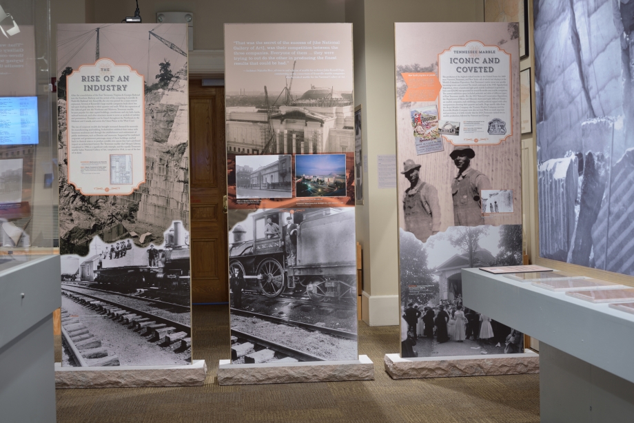 The marble industry was once an important sector of East Tennessee’s economy. By the mid-1850s, East Tennessee marble from Knox County had been chosen for the interiors of the Tennessee State Capitol and marble from Hawkins County was being installed inside the new House of Representatives and Senate wings of the United States Capitol. In the decades that followed, East Tennessee’s varicolored marble was sought by architects and patrons for the interiors of public buildings: state capitol buildings, courthouses, and city halls. Tennessee marble would soon also be ordered for high traffic railroad terminal flooring across the United States and Canada.