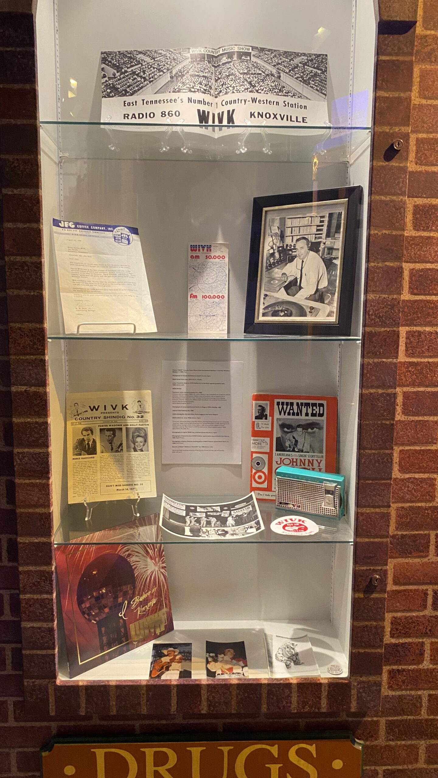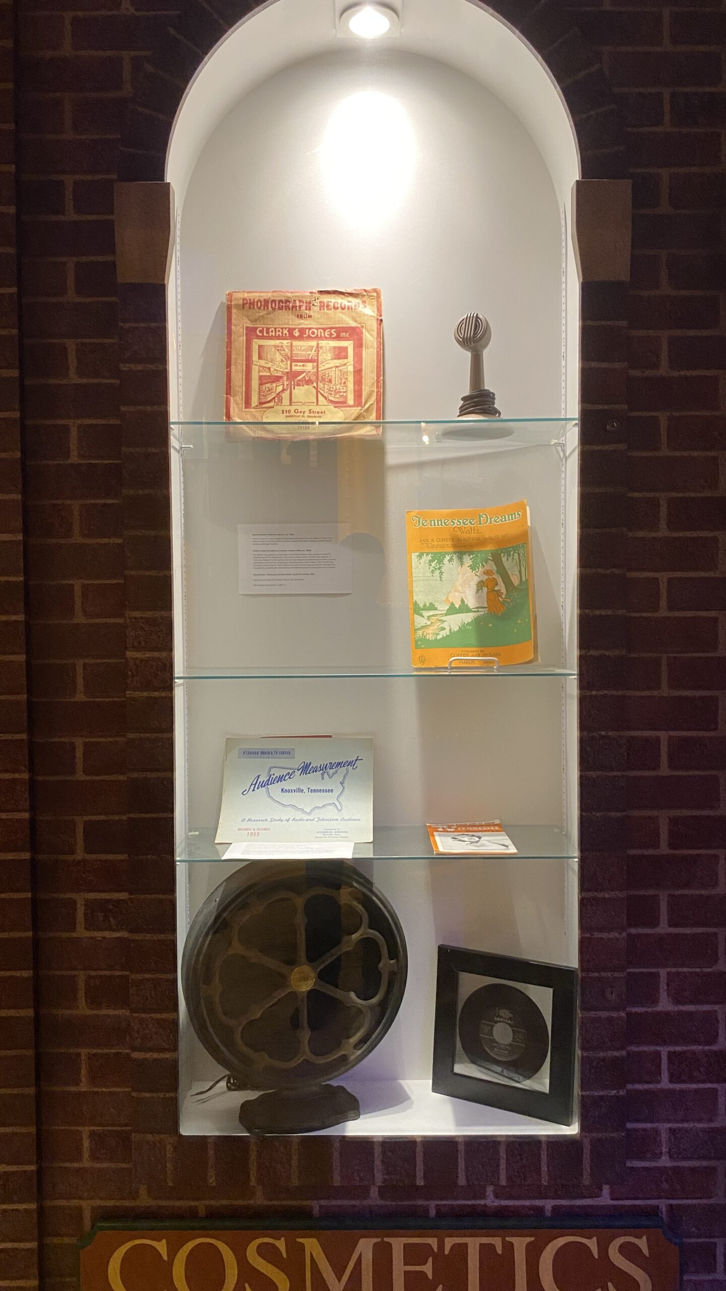 A.C. Wilson, who became known as “Acey Boy,” was hired at WIVK in 1954. Wilson was the first African American DJ in Knoxville. “Acey Boy” began hosting R&B shows such as “Sunset Serenade” in 1949, starting out on WKGN before moving to WIVK. From 1955 to 1956, he would also appear on local television, hosting “Teen Tavern” on WTVK Channel 26. Wilson passed away in 1959. On display is a button advertising “Acey Boy” on WIVK’s station.